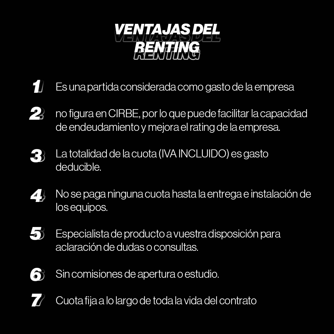 En Fitness Tech queremos ser tu aliado, nuestro objetivo es asistirte en la mejora de tus entrenamientos y en la obtención del gimnasio que tienes en mente, sin que tu presupuesto sea un obstáculo. Por ello, te brindamos nuestro servicio de renting para que puedas adquirir el material deportivo que necesitas sin dificultades. Este servicio es válido desde 24 meses hasta 60 meses, a partir de 2.000€ en adelante.