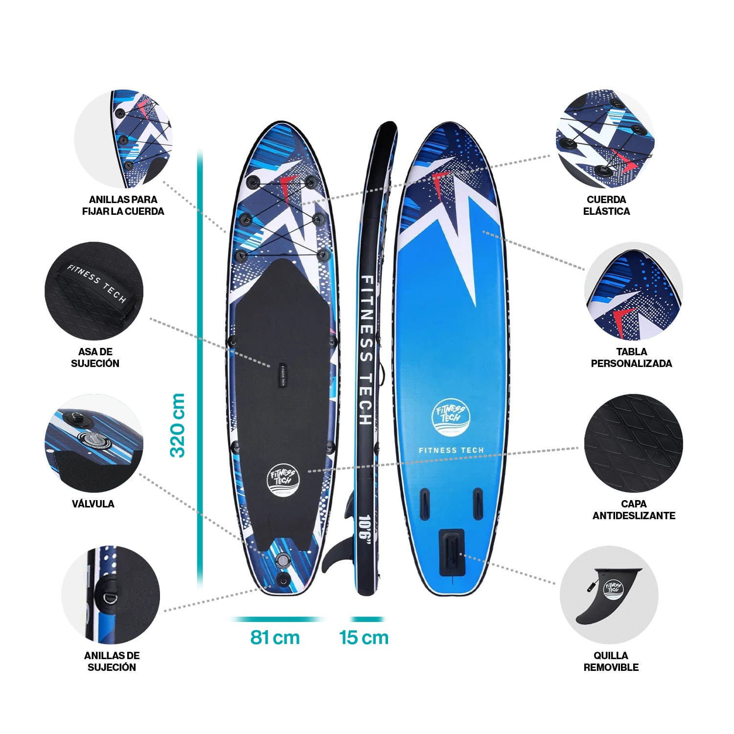 Descubre nuestra tabla de paddle surf multifuncional y versátil de Fitness Tech, adecuada para surf, yoga y pesca, resistente tanto en agua dulce como salada. Ideal para principiantes y usuarios avanzados.